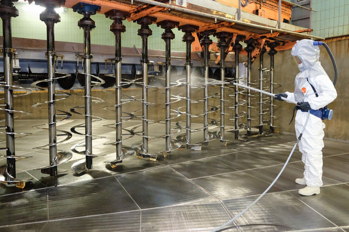 A la malterie de Vitry-le-François, qui compte 12 germoirs et 2 cuves de trempes sur les unités M1 et M2 où le nettoyage est manuel, ces procédures rigoureuses sont consciencieusement effectuées une fois par jour. Jamel Bahri, employé depuis 6 ans chez Malteurop, est l’un des ouvriers de production qui réalise cette tache considérable au vu de la dimension des germoirs et du temps de nettoyage de chaque enceinte (entre 4 à 8 heures selon l’encrassement de la cuve). Revêtus de gants et d’une combinaison de protection chimique par dessus laquelle ils enfilent un heaume et un harnais avec ceinture de ventilation, les ouvriers ainsi exposés aux dangers liés à l’utilisation de la javel diluée avec fort risque de projection lors du rinçage à haute pression, subissent également de nombreuses contraintes posturales.
