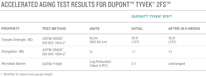 Tyvek® 2FS™ a été lancé après la réalisation des tests de vieillissement accéléré sur Tyvek® 1073B et Tyvek® 1059B. Le test de vieillissement accéléré mené à bien sur Tyvek® 2FS™ a été réalisé conformément aux normes en vigueur à ce moment-là. Dans cette étude, les échantillons de Tyvek® 2FS™ ont été vieillis pendant 36,5 semaines à 55 °C et une humidité relative de 75 %. Les échantillons vieillis n'ont montré aucune différence sur le plan de leur résistance à la traction, de leur allongement et de leurs propriétés de barrière microbienne.