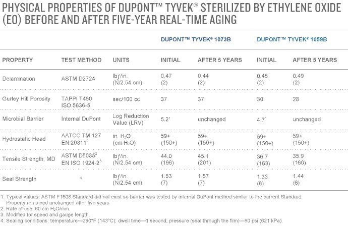 DuPont teste la durée de conservation de Tyvek® depuis 1972. Une étude particulièrement importante, débutée en 1978, portait sur l'étude de la durée de conservation à long terme de Tyvek® 1073B et de Tyvek® 1059B stérilisés à l'oxyde d'éthylène (OE). L'objectif de cette étude, menée à bien par DuPont Haskell Laboratory for Toxicology, était d'observer l'efficacité de ces styles de Tyvek® pour la résistance à la pénétration des spores bactériennes en suspension dans l'air. Ce test a été conçu pour présenter un défi plus difficile, sur le plan microbien, que les conditions généralement rencontrées dans la réalité.