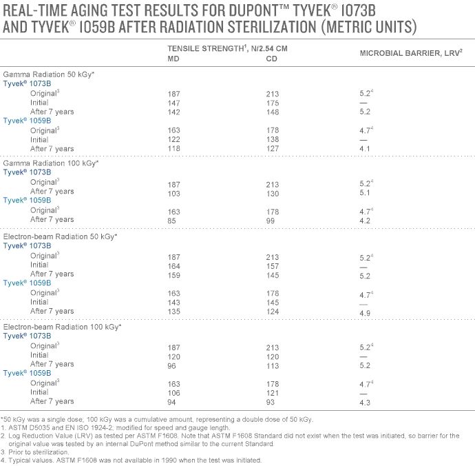 Tyvek® 1073B et Tyvek® 1059B ont également passé des tests de vieillissement en temps réel après avoir été stérilisés par rayonnement gamma et par faisceau d'électron. Leur résistance à la traction et leurs propriétés de barrière microbienne ont été testées avant et après le vieillissement. Les résultats du test démontrent que Tyvek® est résistant aux radiations.
