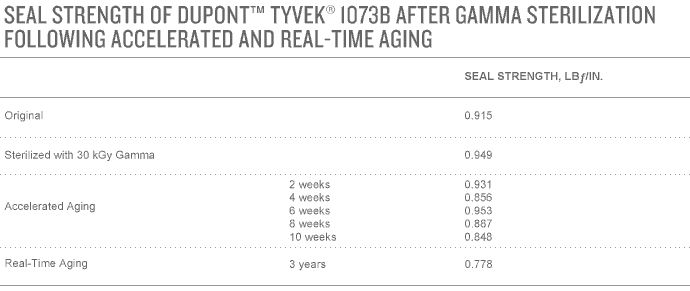autre test a démontré que les effets de la stérilisation par rayonnement gamma et du vieillissement sur son pouvoir adhésif étaient insignifiants. Des sachets de Tyvek® 1073B de 2,5-mil polyester/polyéthylène ont été irradiés par rayonnement gamma (30 kGy) puis stockés pendant 10 semaines à 55 °C et dans une humidité ambiante relative, et enfin stockés pendant cinq ans dans des conditions ambiantes. Au terme de la période de stockage, le pouvoir adhésif des sachets a été réévalué conformément à la méthode d'essai ASTM F88.
