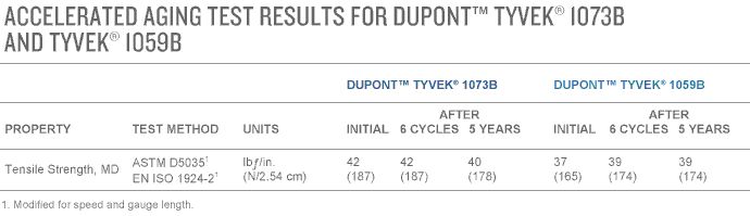 Les performances de Tyvek® sont également très bonnes dans les études de vieillissement accéléré. Au cours de la même étude, des échantillons de Tyvek® 1073B et Tyvek® 1059B ont subi six fois un cycle de températures extrêmes, ce qui équivaut à un vieillissement de six ans. Un cycle se composait de deux semaines à 54 °C et 17 % d'humidité relative, deux jours à -20 °C et deux semaines à 54 °C avec une humidité relative comprise entre 70 % et 80 %. Après cela, les échantillons ont été stockés pendant cinq ans à température et humidité ambiantes, à l'issue desquels leur résistance à la traction n'a montré aucun changement statistiquement significatif.