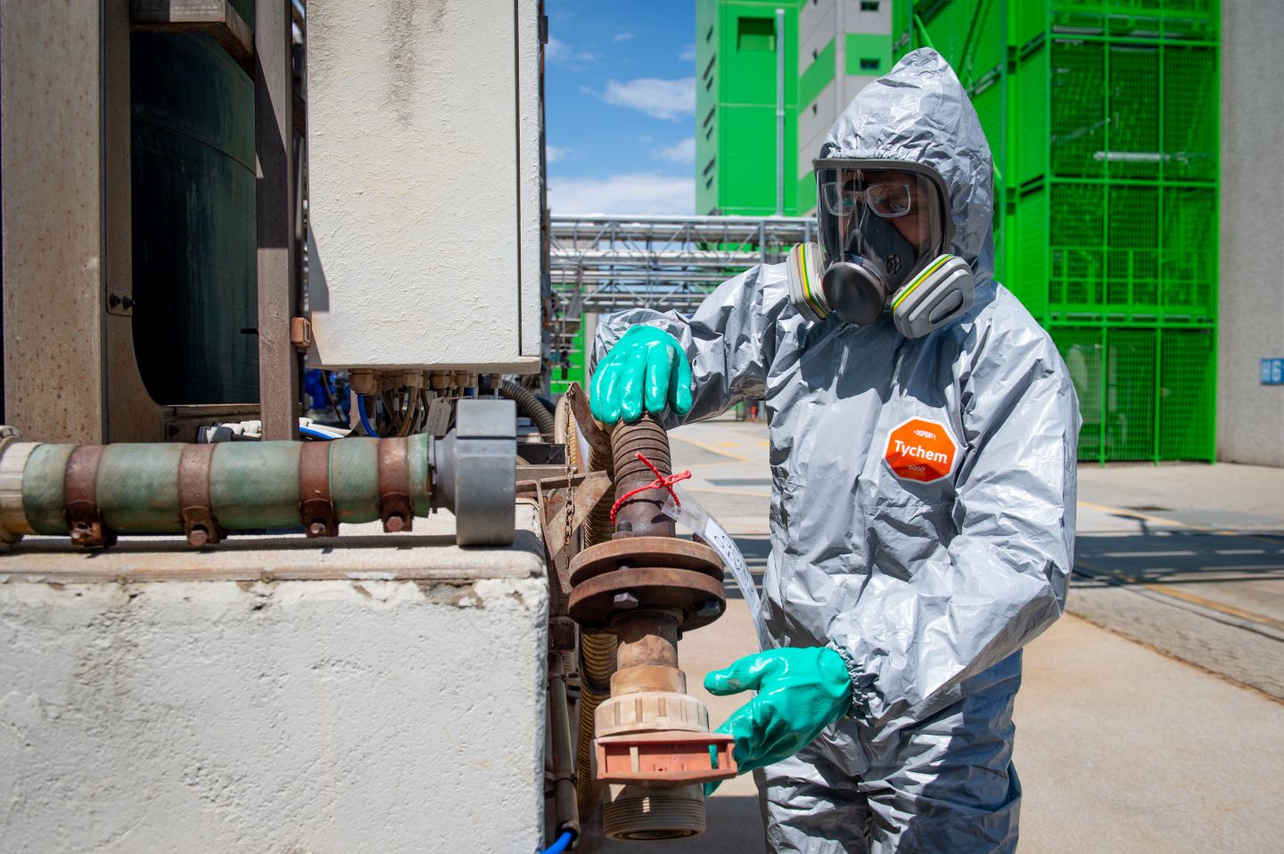 Les vêtements DuPont™ Tychem®, conçus pour offrir une protection contre un large éventail de risques chimiques, peuvent être particulièrement utiles dans le secteur ferroviaire pour les besoins de résistance chimique contre les liquides dangereux, notamment les acides, les bases et les solvants. Il s'agit-là d'une caractéristique cruciale pour les travailleurs impliqués dans des tâches de maintenance et de nettoyage susceptibles de les exposer à des éclaboussures de substances chimiques.