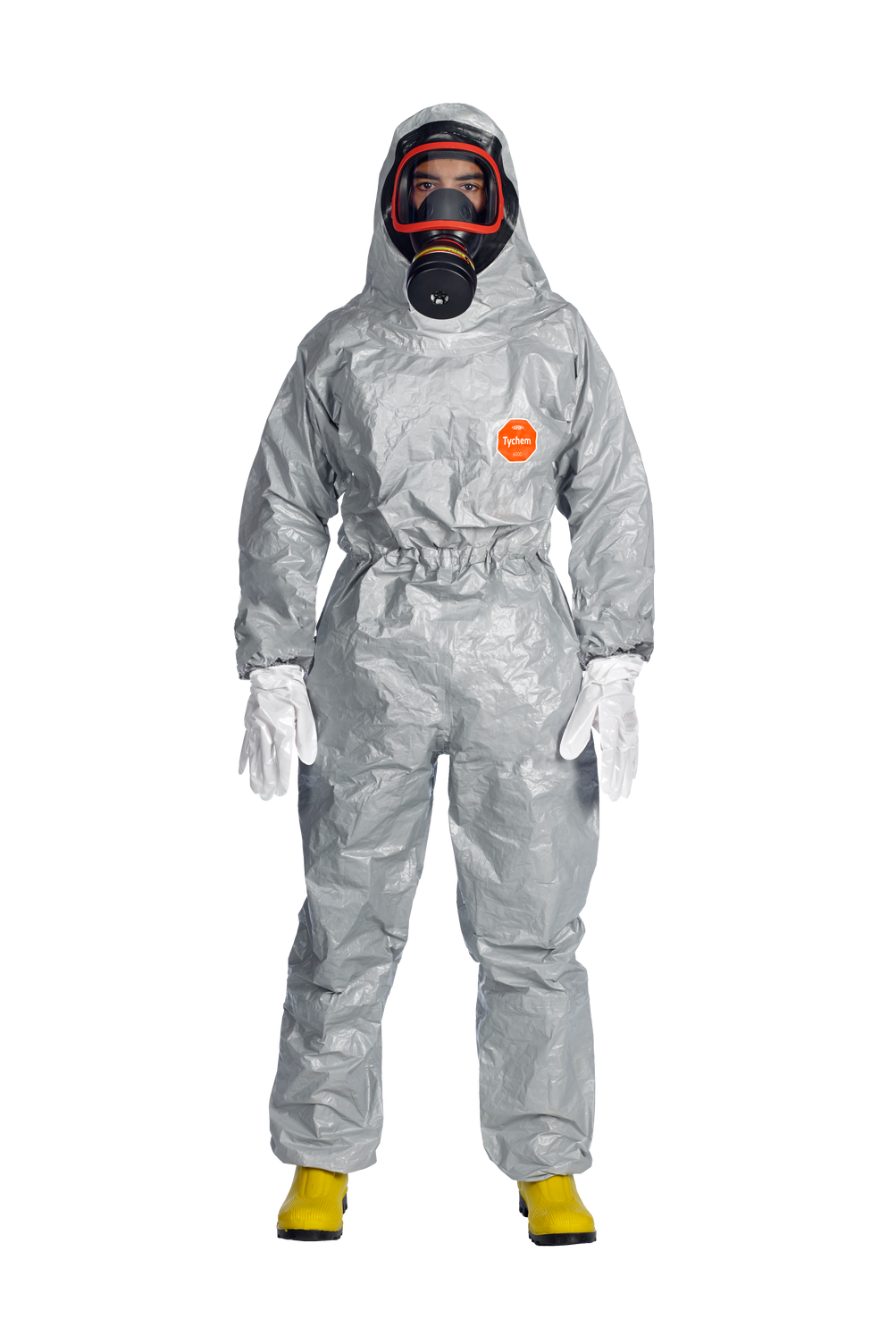 DuPont™ Tychem® 6000 F FaceSeal. Combinaison à capuche avec joint en caoutchouc à la capuche pour un ajustement serré autour du masque respiratoire. Disponible en gris, et dans les tailles SM à 5X. Taille élastiquée pour un ajustement optimal, doubles manchettes avec sous-gants attachés, chaussettes dissipatives avec rabats de bottes et entrée arrière pour une meilleure protection du porteur.Les vêtements Tychem® 6000 F sont constitués d'un matériau léger et durable (<500 g par vêtement) associant un film barrière exclusif laminé sur un substrat de Tyvek® haute résistance. Ils offrent une excellente résistance à la perméation chimique d'une grande diversité de produits chimiques, pour aider à protéger le personnel contre de nombreux produits chimiques organiques industriels toxiques, produits chimiques inorganiques très concentrés (même pressurisés), les particules, les risques biologiques et certains agents de guerre chimiques. Tychem® 6000 F Faceseal, est utilisé pour un large éventail d'applications, allant de la fabrication et du nettoyage industriels et des premiers secours aux applications militaires et pétrochimiques, en passant par le nettoyage de déversement de produits chimiques.