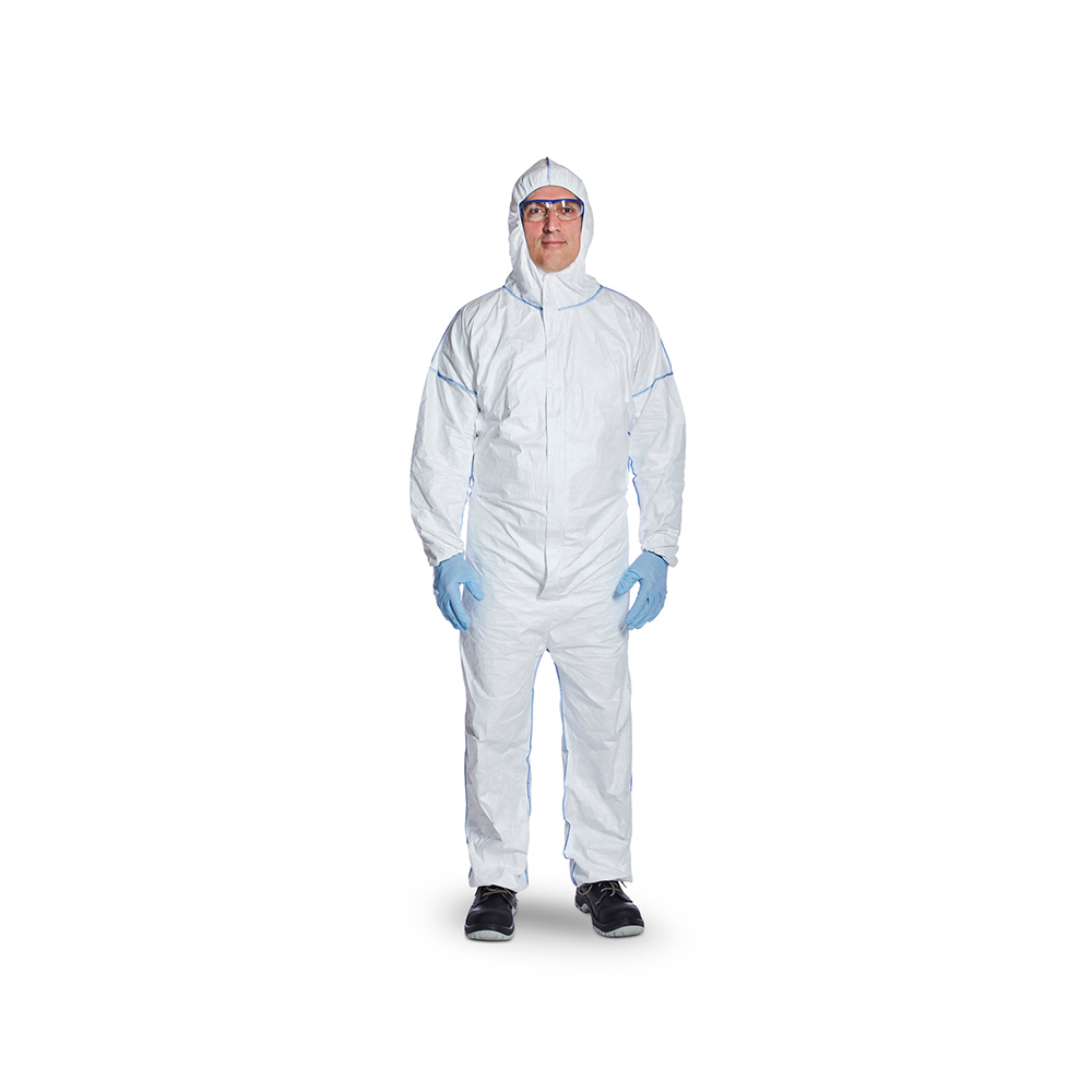 | Conception | Combinaison à cagoule élastiquée, panneau avant en Tyvek®, dos en SMS |